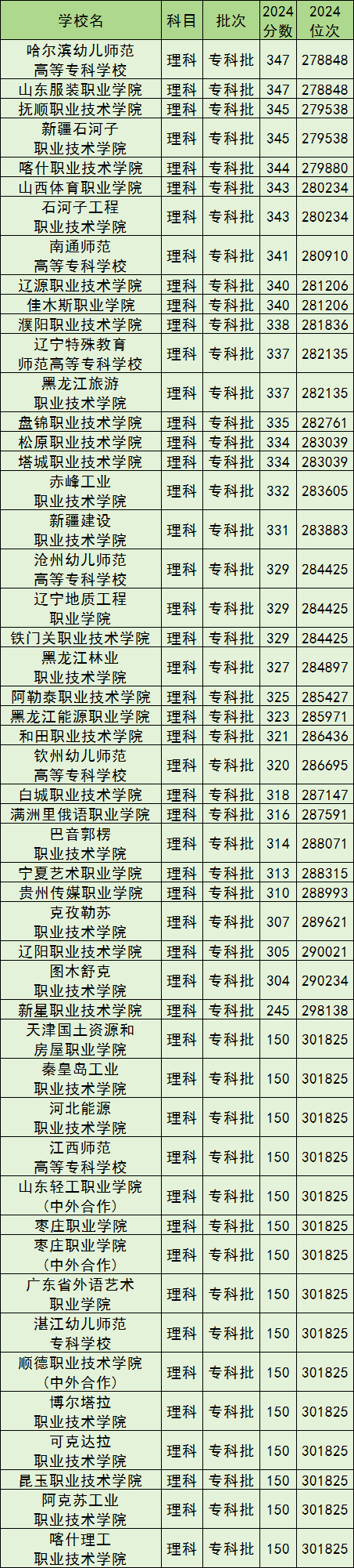 最好考、收分最低的公办专科学校是喀什理工职业技术学院,学校2024年理科最低投档分为150分。