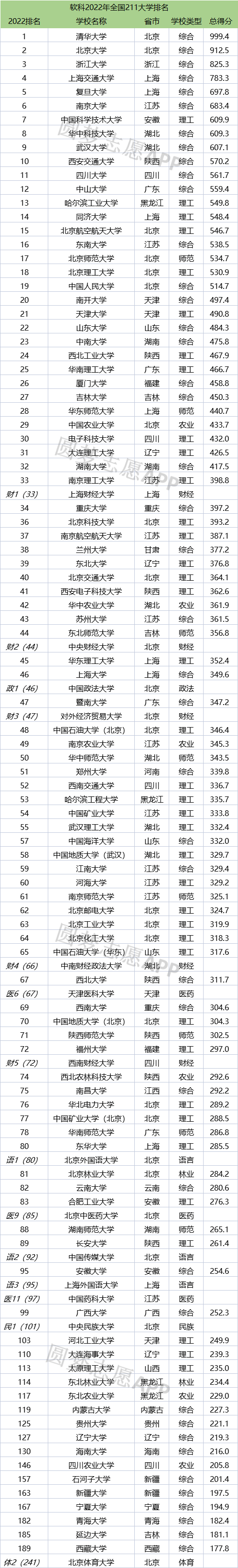 下面是软科2022年211大学综合实力排名名单一览表: