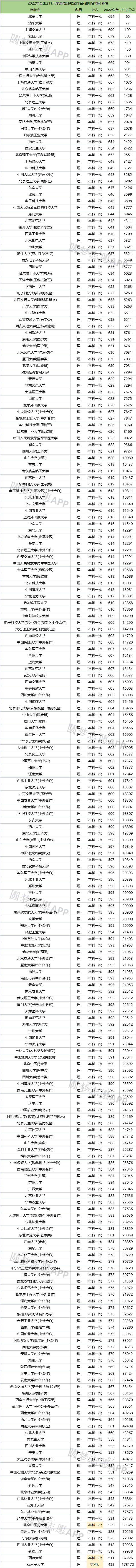 为了给各位高考生更好的参考,除了211大学实力排名之外,下文还以“四川省理科”2022招录数据为例,为大家整理了2022年全国211大学录取分数线排名表。想了解更多省份211分数线的考生,可下载志愿辅助软件圆梦志愿APP查询。