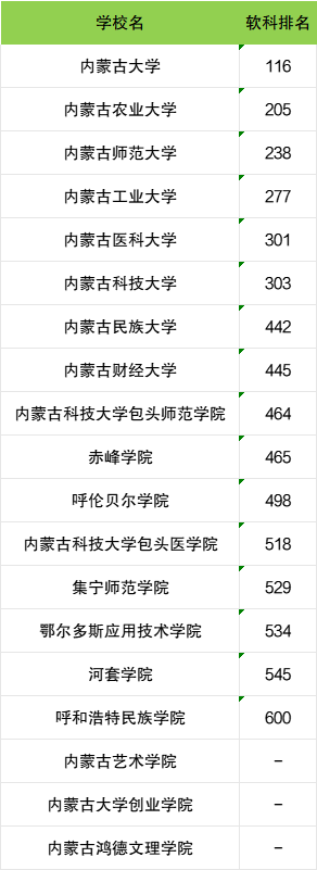 下面是内蒙古自治区二本大学最新排名一览表,供参考: