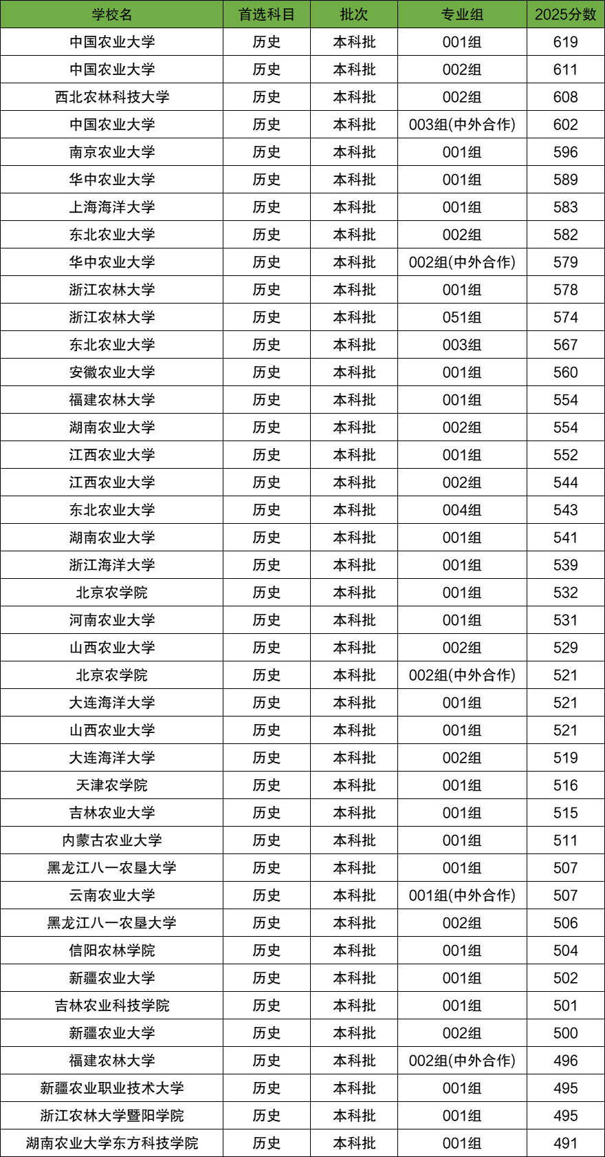 其中最低分院校为湖南农业大学东方科技学院,2025年最低分为491分。最高分院校为中国农业大学,2025年最高分为619分。