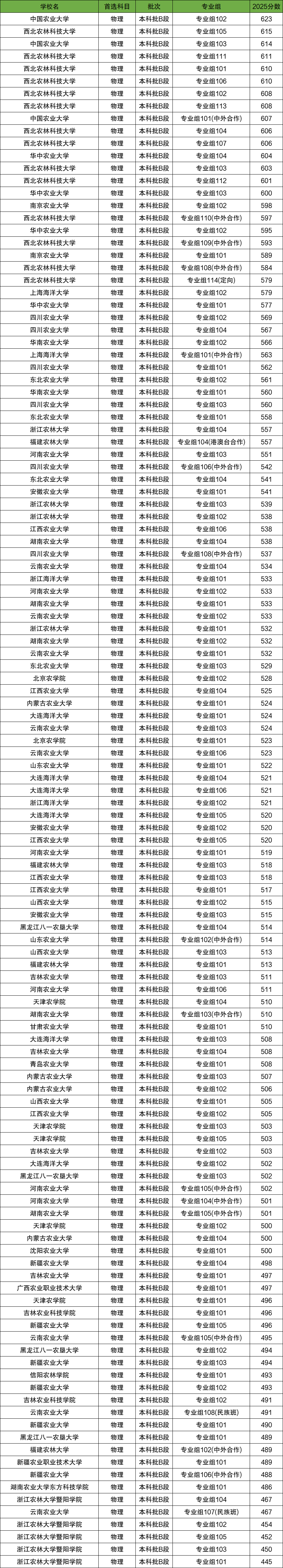 其中最低分院校为浙江农林大学暨阳学院,2025年最低分为445分。最高分院校为中国农业大学,2025年最高分为623分。