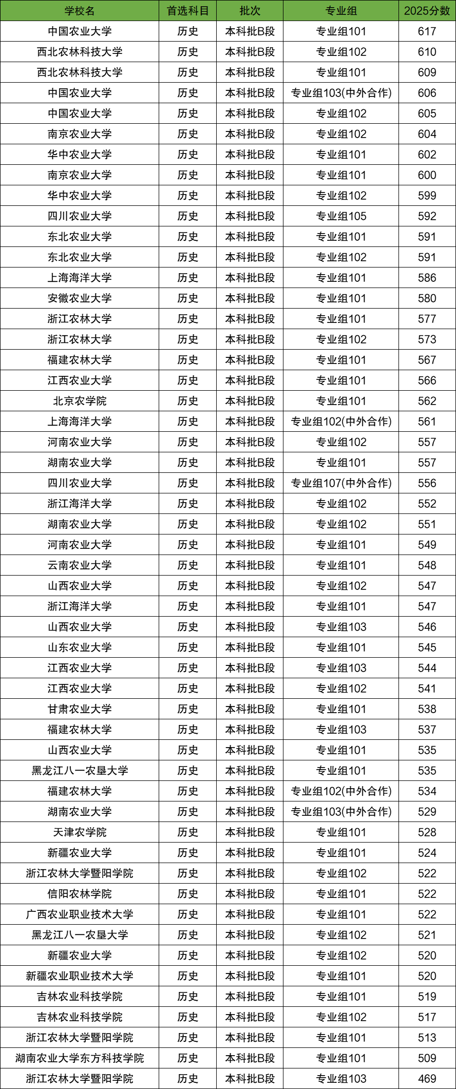 其中最低分院校为浙江农林大学暨阳学院,2025年最低分为469分。最高分院校为中国农业大学,2025年最高分为617分。
