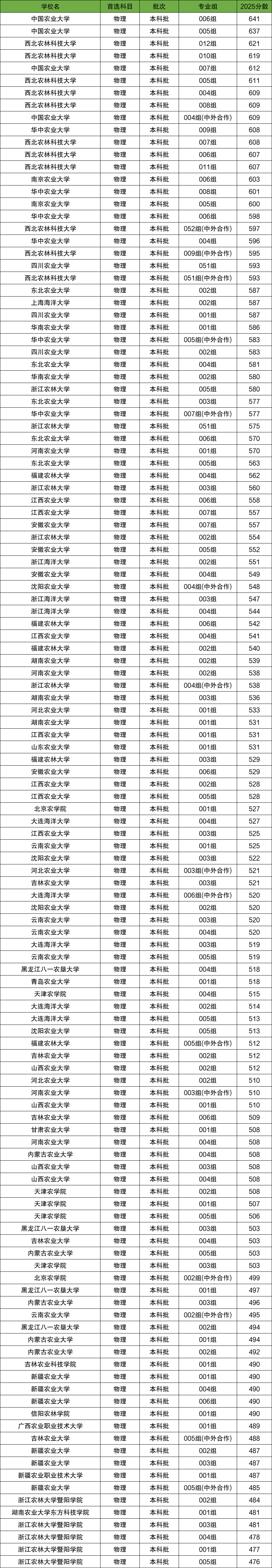 其中最低分院校有浙江农林大学暨阳学院,2025年最低分为476分。最高分院校为中国农业大学,2025年最高分为641分。