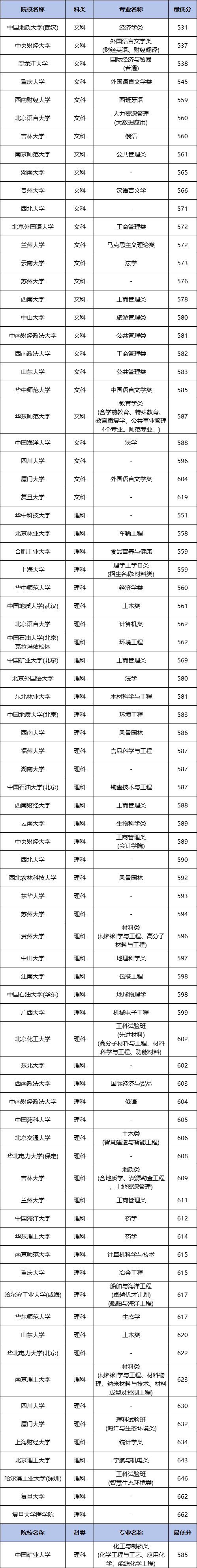 文科分数最低为中国地质大学(武汉)的531分,最高为复旦大学的619分。也就是说在四川省文科类考生最低531分,就能报考高校专项计划并且有把握被录取。