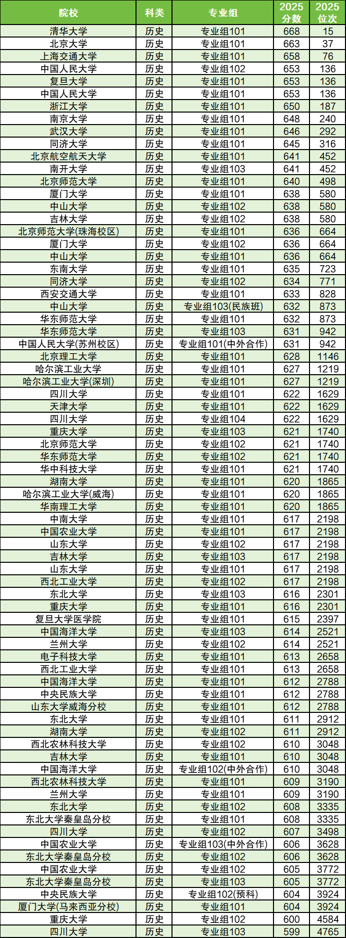 2025年985大学在四川历史组招生的分数在599分到668分之间不等,招生专业组共计73个。最高分院校是清华大学(101组),2025年投档最低分为668分,对应最低位次15名,是历史组中最难报考的985院校。除此之外,分数超过650分的院校专业组还有北京大学101组(663分、37名)、上海交通大学101组(658分、76名)、中国人民大学102组(653分、136名)等,可供高分考生冲刺选择。
