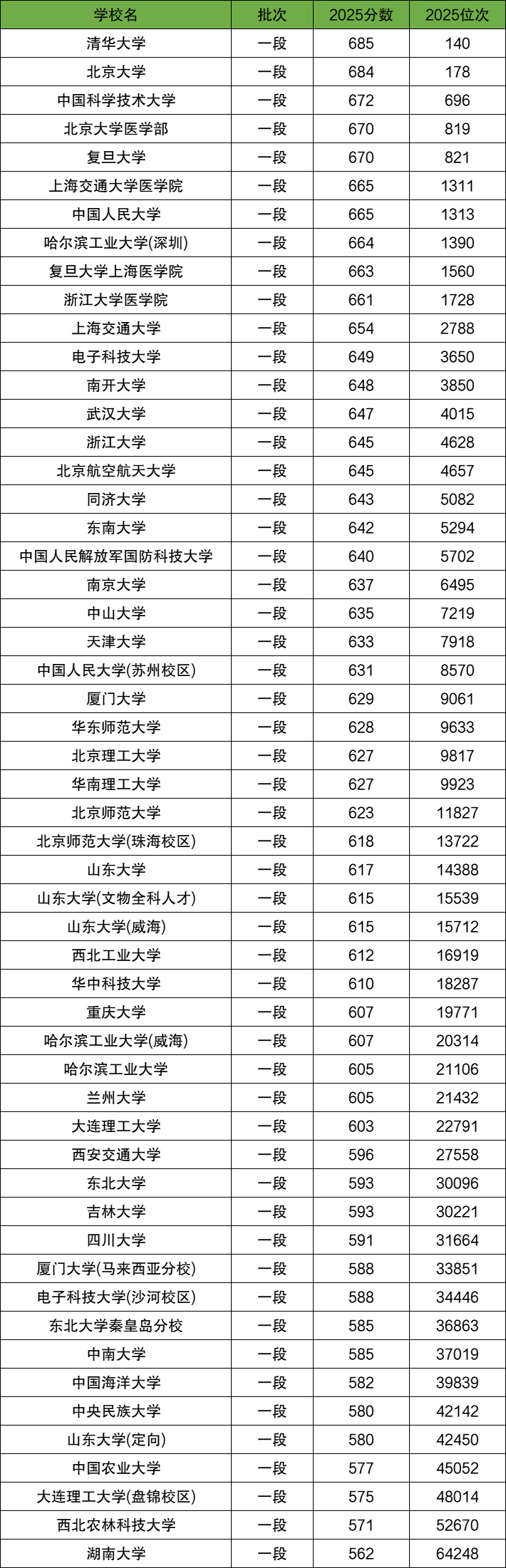 在山东录取分数线最高的985院校是清华大学,投档分数为685分,北京大学以684分的分数线紧随其后,在报考门槛上这2所顶尖院校难分伯仲。而在山东高考录取分数线最低的985大学为湖南大学,2025年湖南大学在山东的最低投档线出现了明显的断档,仅要562分,排名64248,就可以被湖南大学录取。