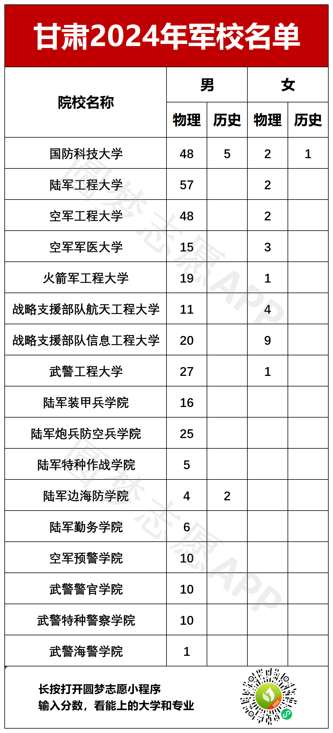 甘肃省内没有开设军校,根据2024年的招生计划来看,在甘肃招生的军校包括国防科技大学、武警工程大学、空军工程大学等17所,具体名单如下: