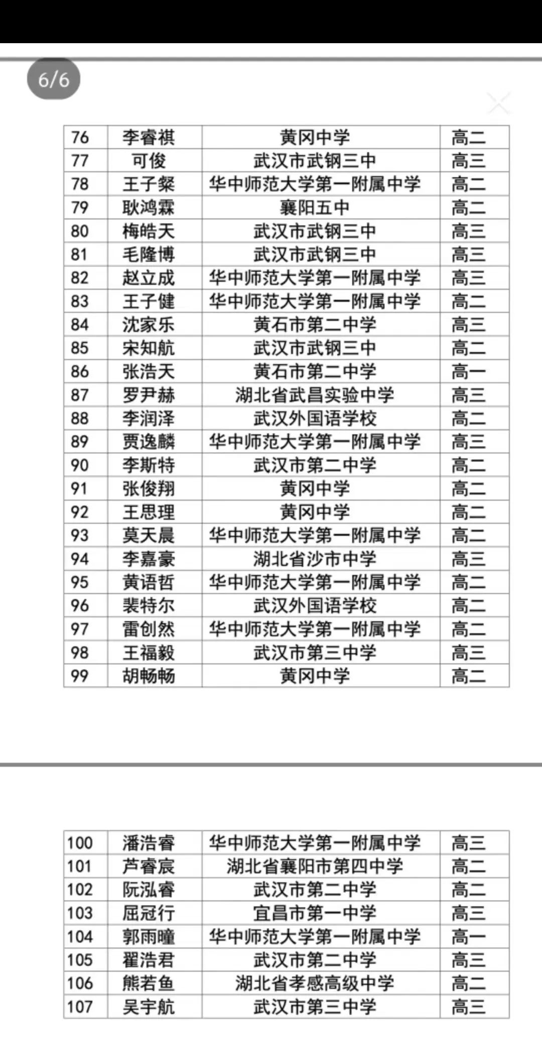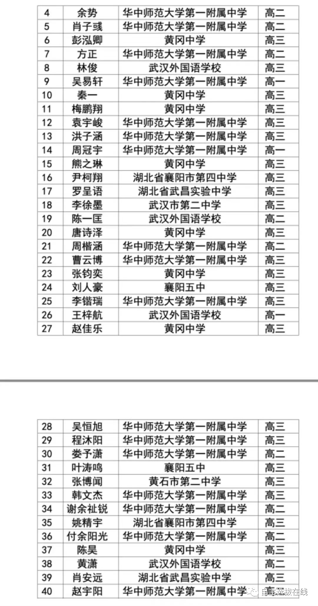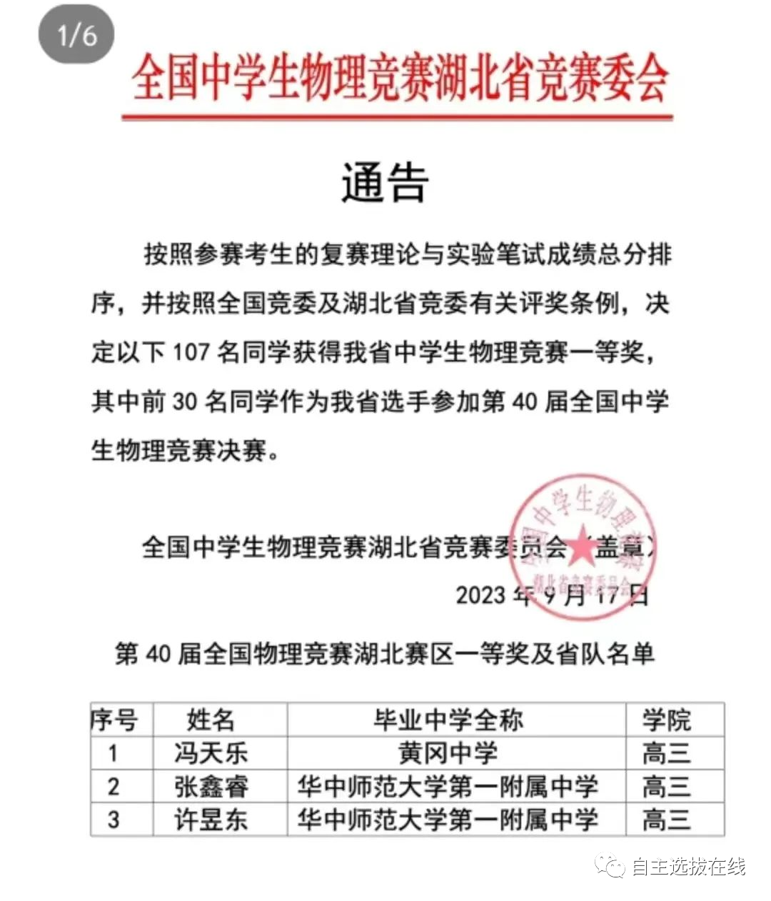 按照全国竞委及湖北省竞委有关评奖条例,决定以下107名同学获得湖北省中学生物理竞赛一等奖,其中前30名同学作为湖北省选手参加第40届全国中学生物理竞赛决赛。第40届全国物理竞赛湖北赛区一等奖及省队名单如下: