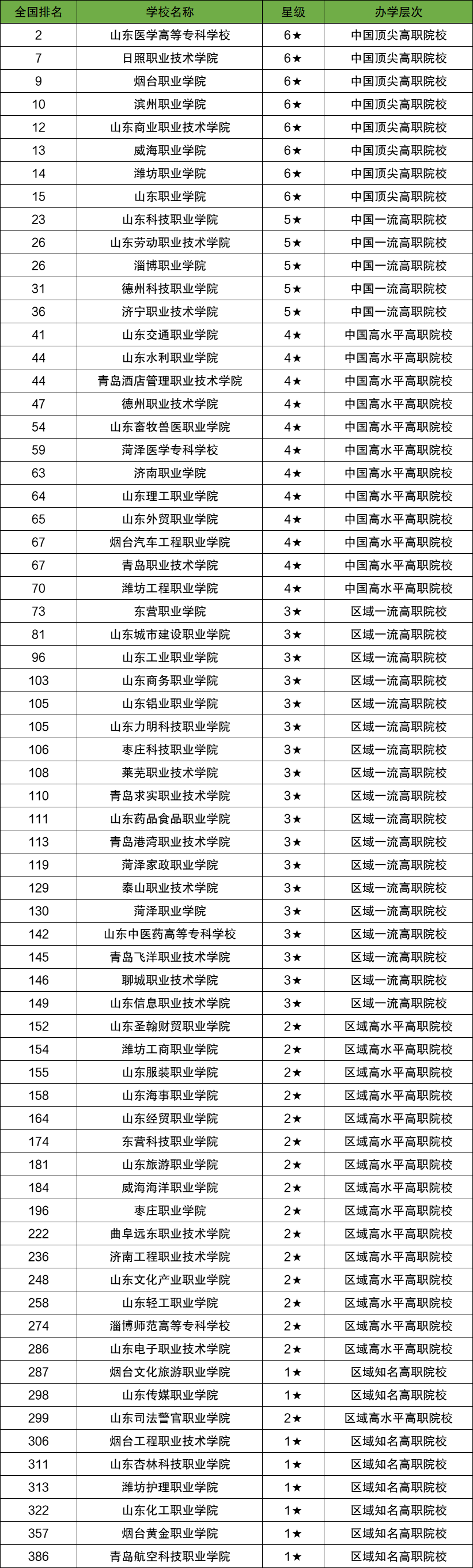 在2025校友会中国高职院校排名中,山东医学高等专科学校全国排名第2名,雄居2025山东省高职院校排名第一。日照职业技术学院全国排名第7,烟台职业学院全国排名第9。
