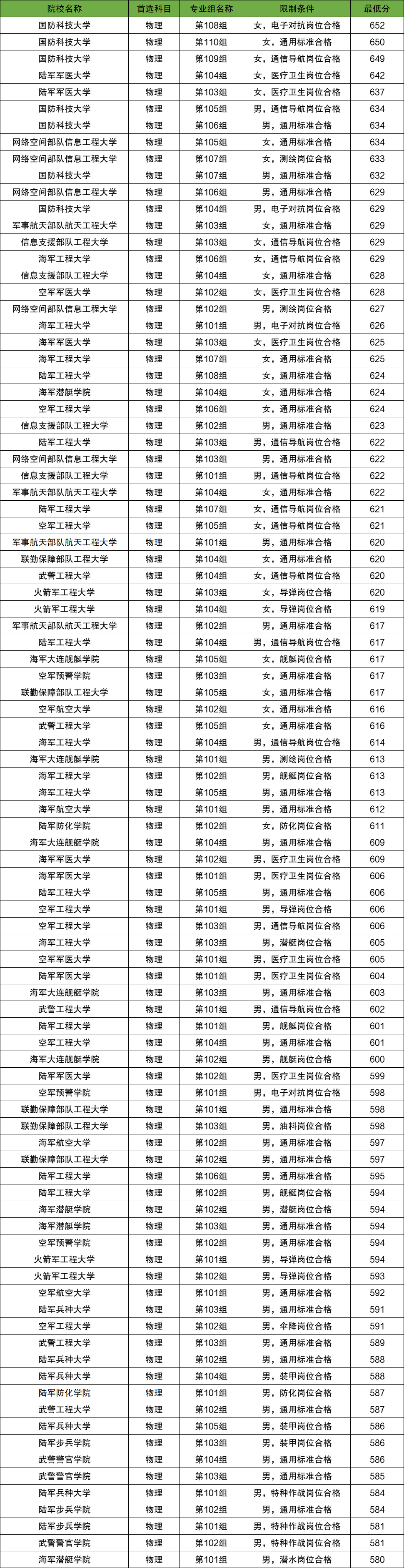 军校在各地区的招生情况必然是不同的,毕竟各地区的高考情况、考生情况都不一样,自然最后的分数线会有不同,关于军校多少分能上的问题本文也就只能参考一个省份的录取数据来分析。