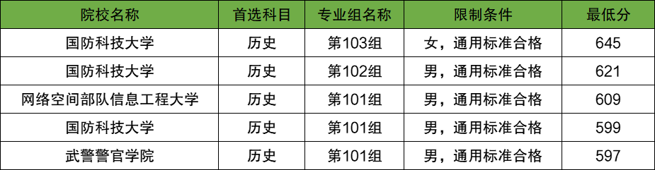 军校中在湖南历史组分专业组最多的院校是国防科技大学,该校在历史组各专业组最低分数线和专业组方向要求如下: