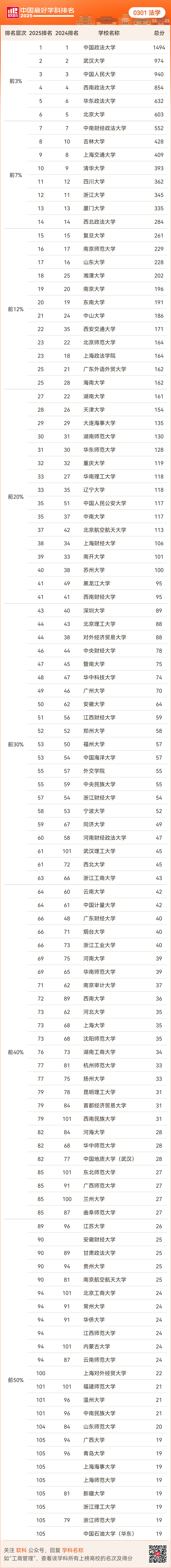 根据最新软科中国最好学科排名,法学学科实力大学排行榜如下。
