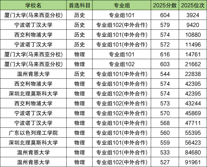 中外合作办学大学分数线最高的是厦门大学马来西亚分校(专业组101),2025年投档分数为604分;