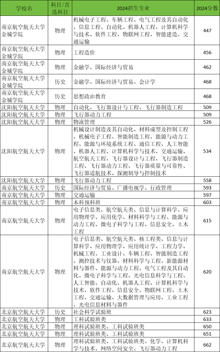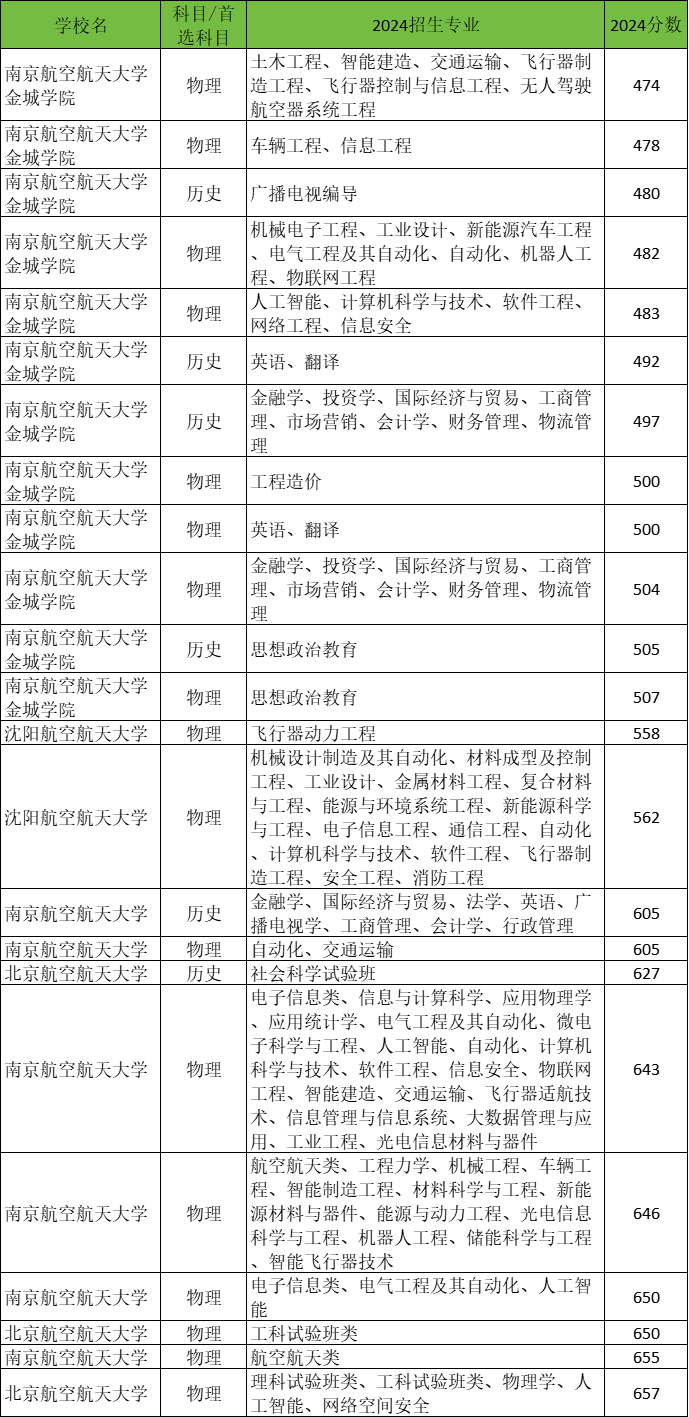 2024年航空航天大学录取分数范围在474分~657分之间,其中物理类考生最好考、收分最低的院校是南京航空航天大学金城学院(土木工程、智能建造、交通运输等),学校最低分为474分。历史类考生最好考、收分最低的院校南京航空航天大学金城学院(广播电视编导),学校最低分为480分。