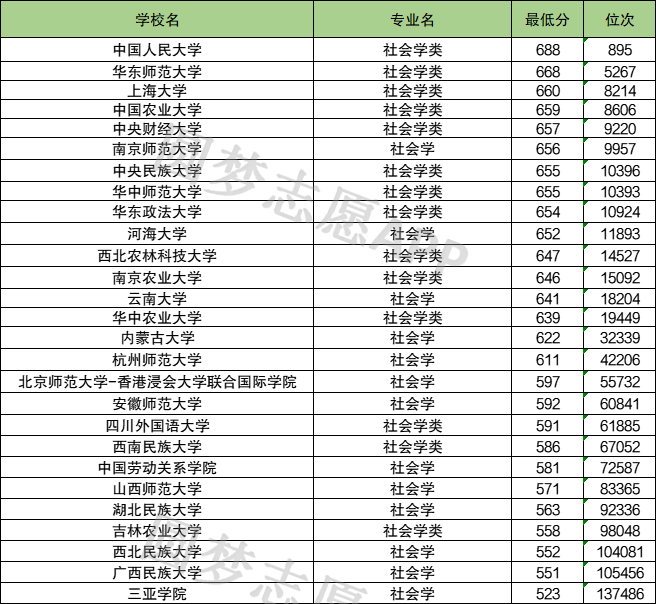 下表为社会学专业中分数线排名前30的大学名单及分数。