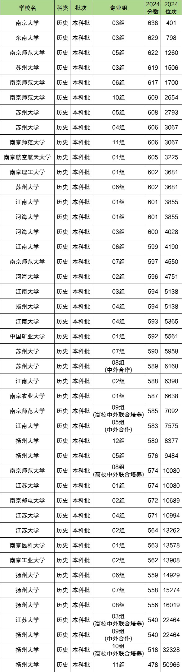 2024年在江苏省历史类科目录取中,收分最高的大学为南京大学03组,2024年最低分为638分,最低位次为401名;其次是东南大学03组,2024年最低分为629分,最低位次为798名。