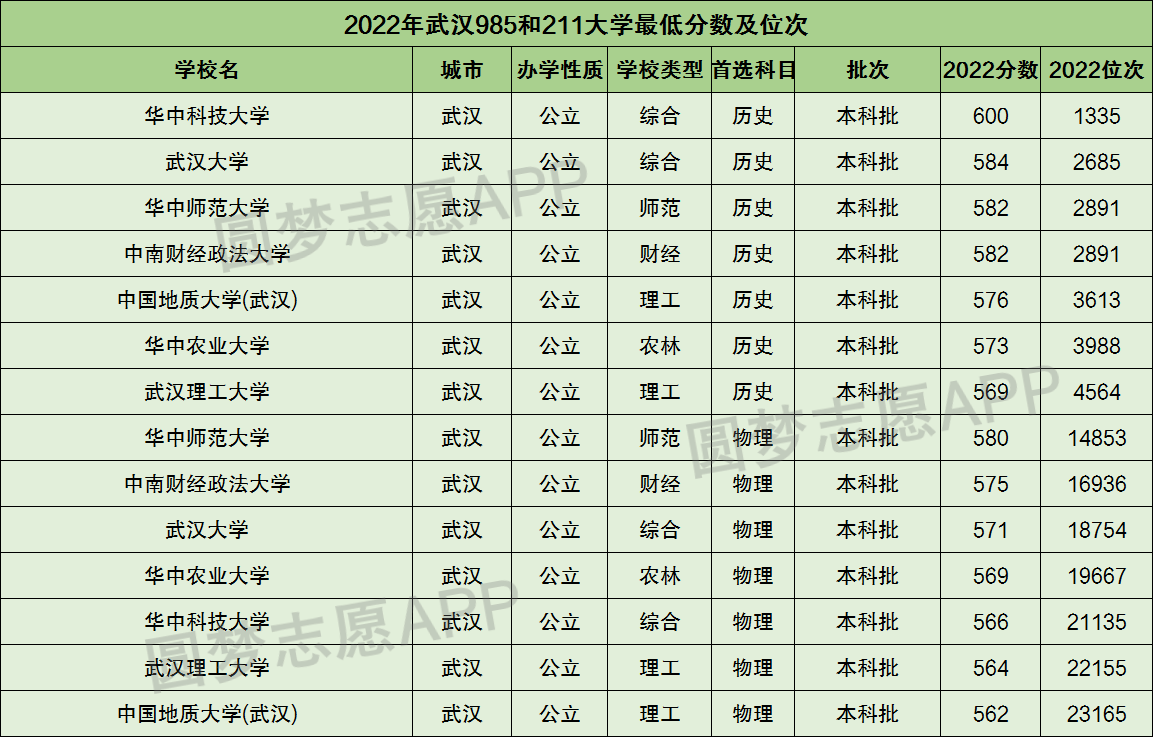 根据圆梦志愿APP提供的数据,小编为大家整理出了武汉市内的985大学和211大学在武汉市物理、历史类的最低分数线及近一年的录取位次。