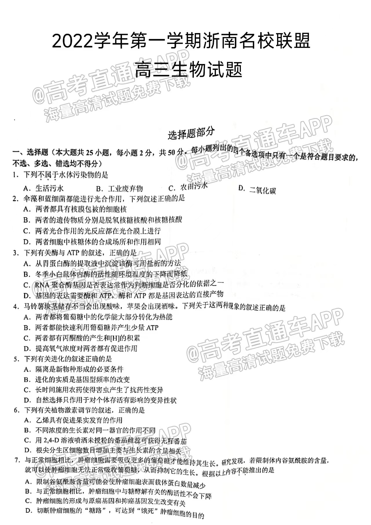 1.2023浙南名校(温州九校)高三十月联考生物试题