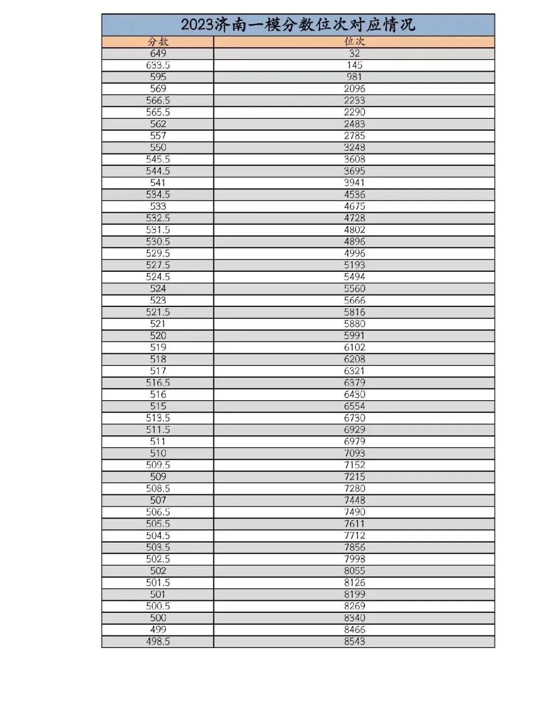 济南一模考试44700人左右参与,其中649分对应位次是32名、595分对应位次981名、533分对应位次4675名。具体如下图所示: