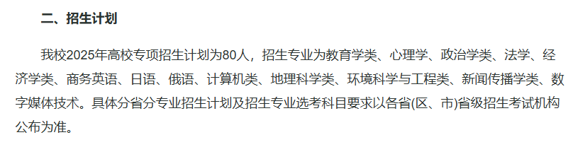 2025年东北师大高校专项计划共招生80人,覆盖13个热门专业,涵盖教育、文学、理学、工学等多领域。具体专业如下: