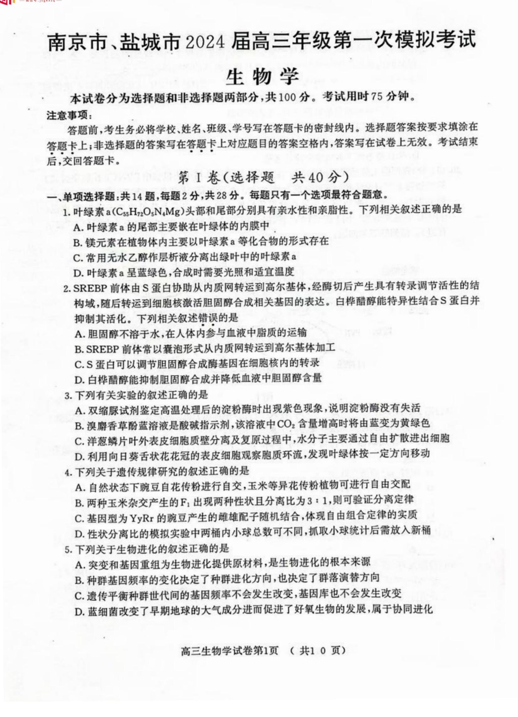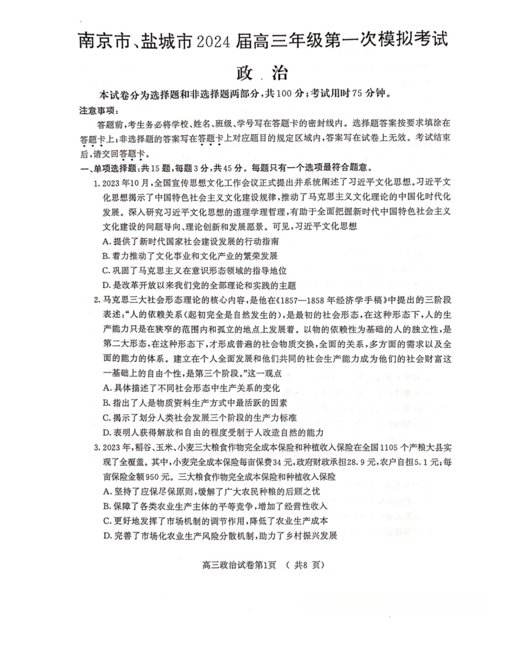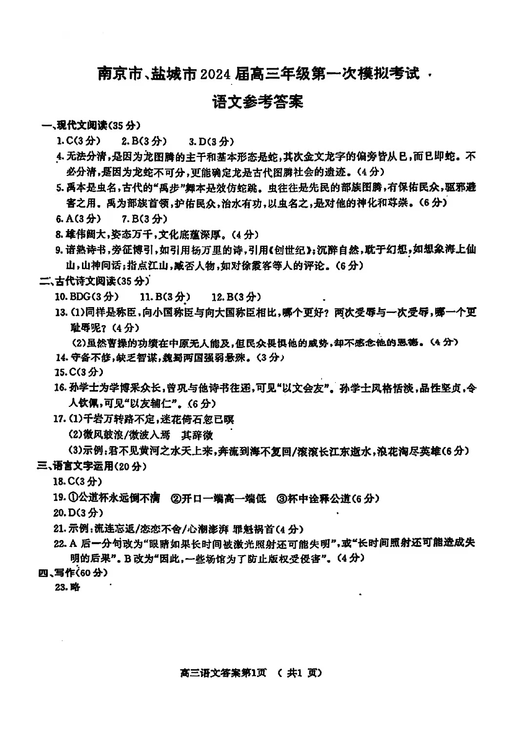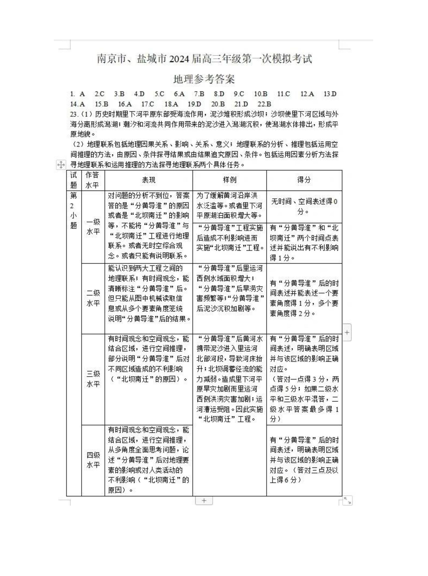 以下为2024南京盐城二模各科试题及答案解析汇总: