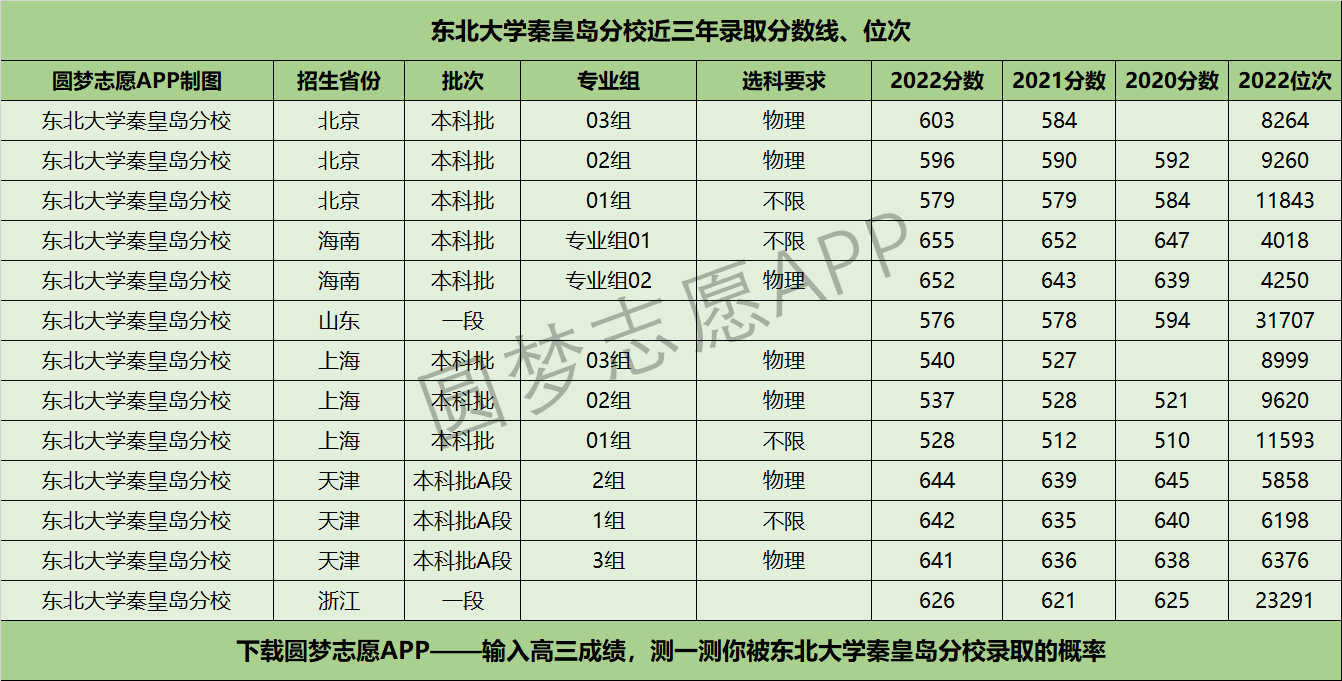 五、东北大学秦皇岛分校近年录取分数线及位次【6选3省份】