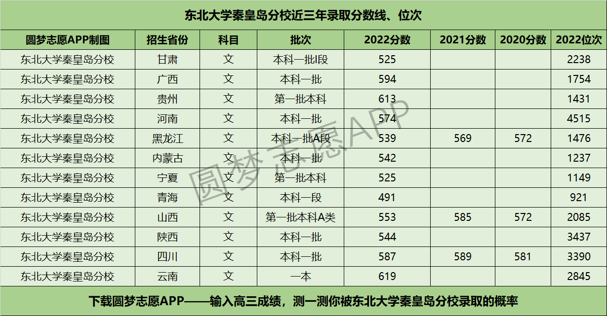 二、东北大学秦皇岛分校近三年录取分数线及位次【文科版】