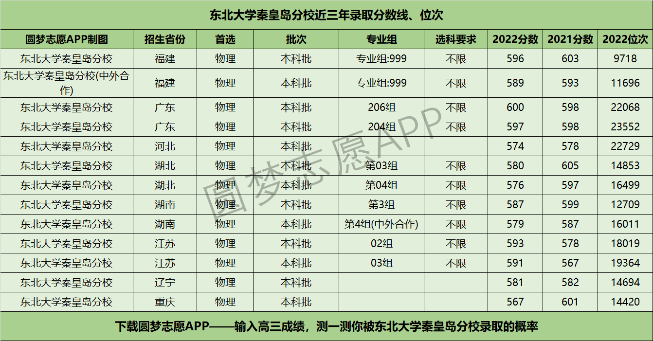 三、东北大学秦皇岛分校近年录取分数线及位次【首选物理版】