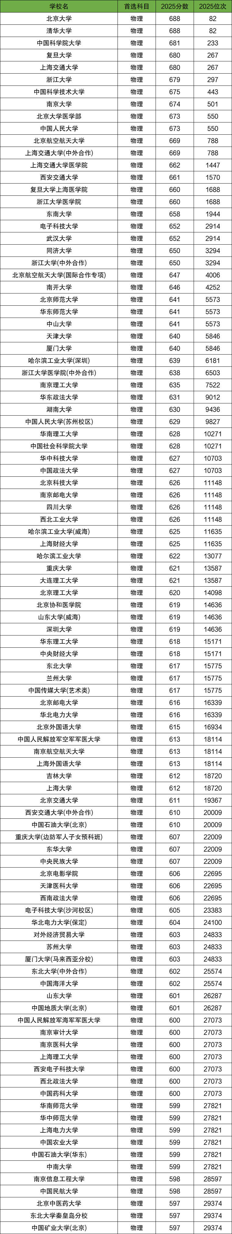 2025年各大院校在河北省物理类录取分数线及位次中,分数线排名前十的大学是: