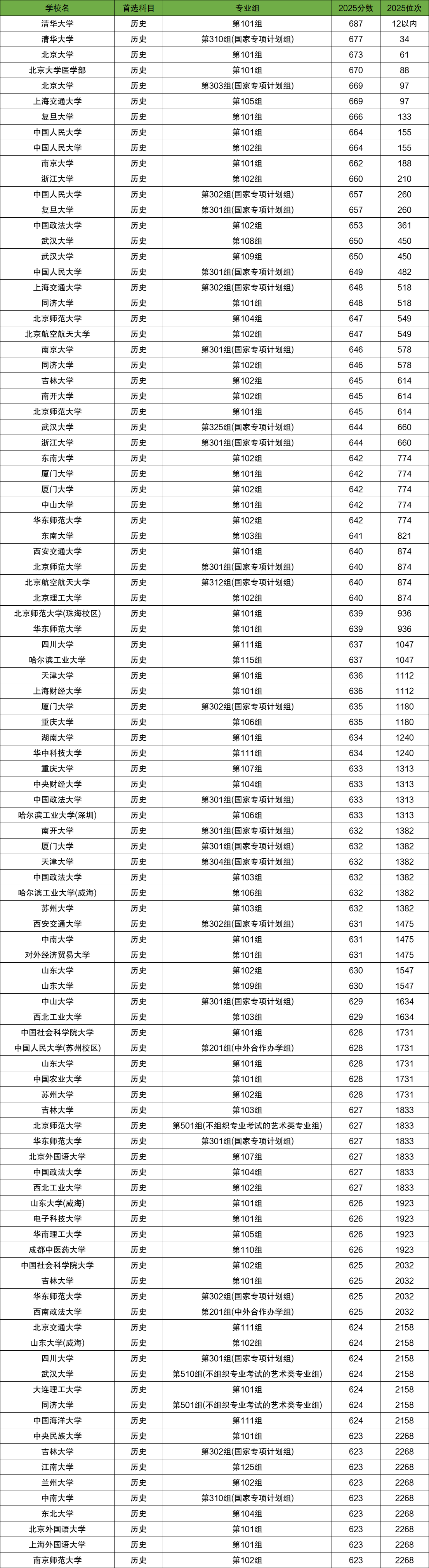 2025年各大院校在河南历史类录取分数线及位次中,分数线排名前十的大学是: