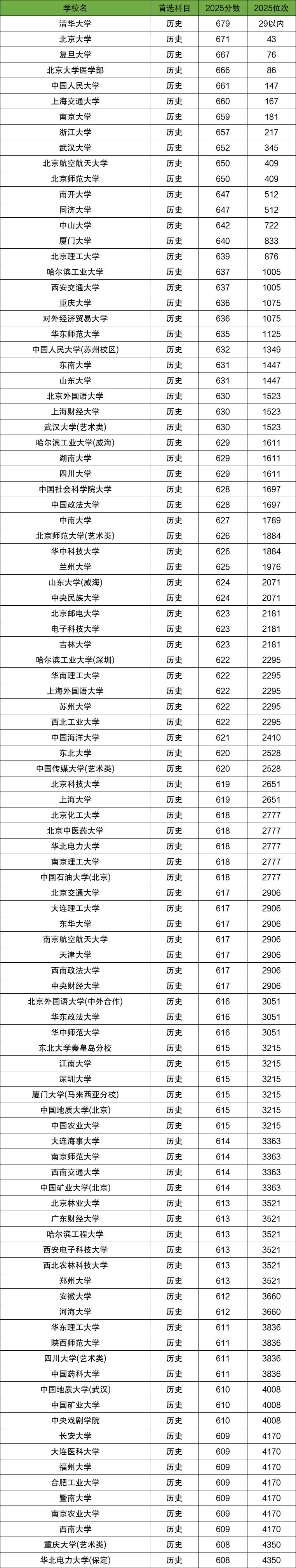 2025年各大院校在河北省历史类录取分数线及位次中,分数线排名前十的大学是: