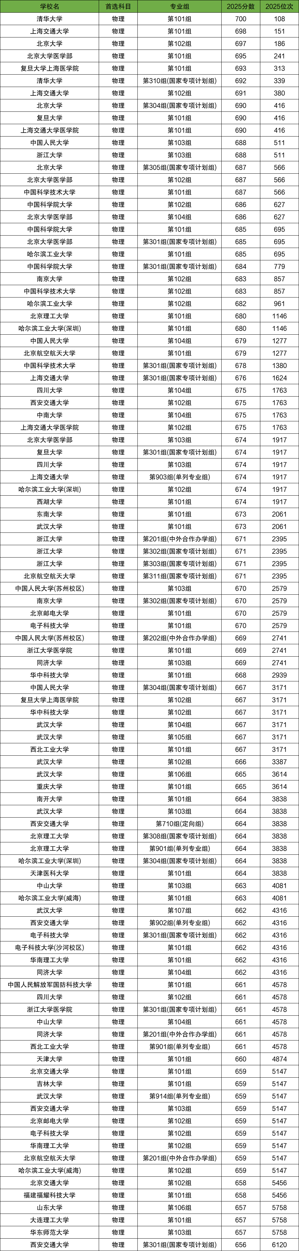 2025年各大院校在河南物理类录取分数线及位次中,分数线排名前十的大学是: