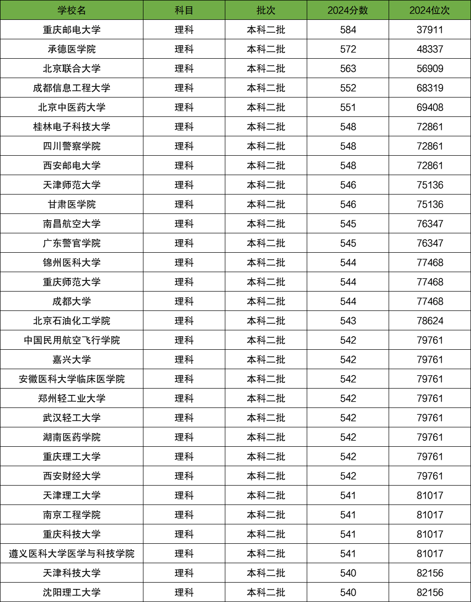 在四川理科全国最好的二本大学有重庆邮电大学(584分)、承德医学院(572分)、北京联合大学(563分)、成都信息工程大学(552分)等院校。其中,重庆邮电大学在2025年校友会理工类大学中排名第73名,承德医学院在2025年校友会医药类大学中排名第59名。