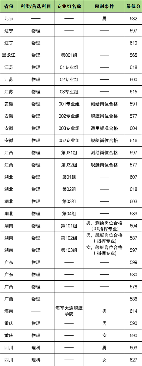 除上述省份外,其余省份上海军大连舰艇学院的最低分如下,供参考: