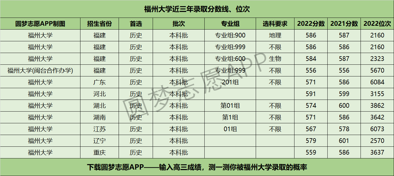 以福州大学在福建近年首选历史的招生情况为例,学校2022年在本科批的最低分为584分,2021年在本科批的最低分为587分,两年的最低分范围为584~587分。