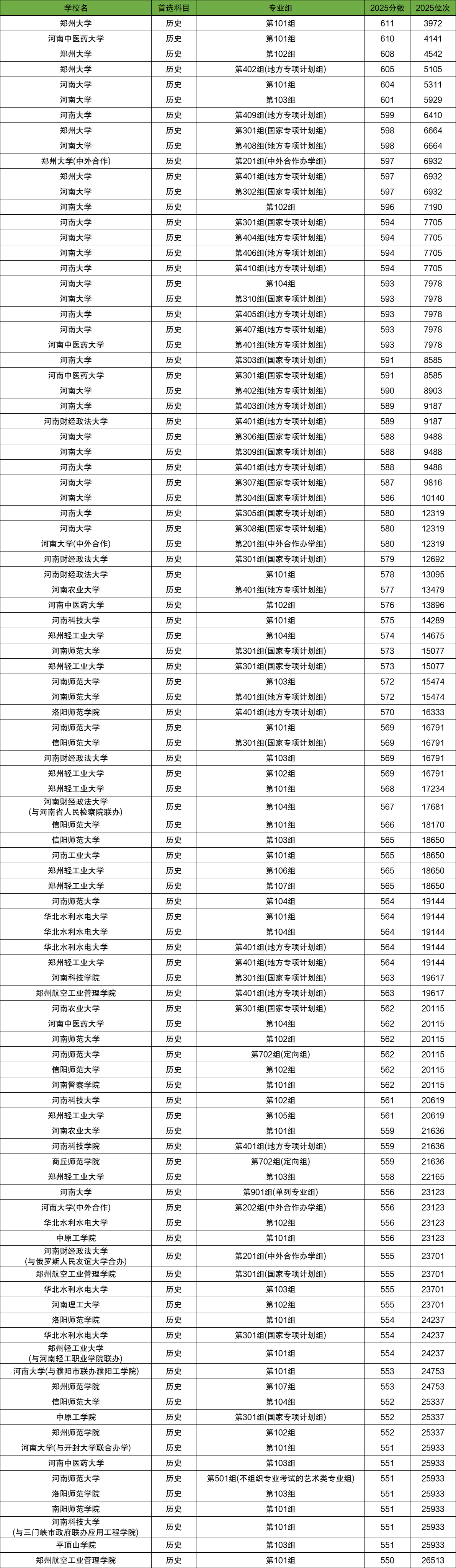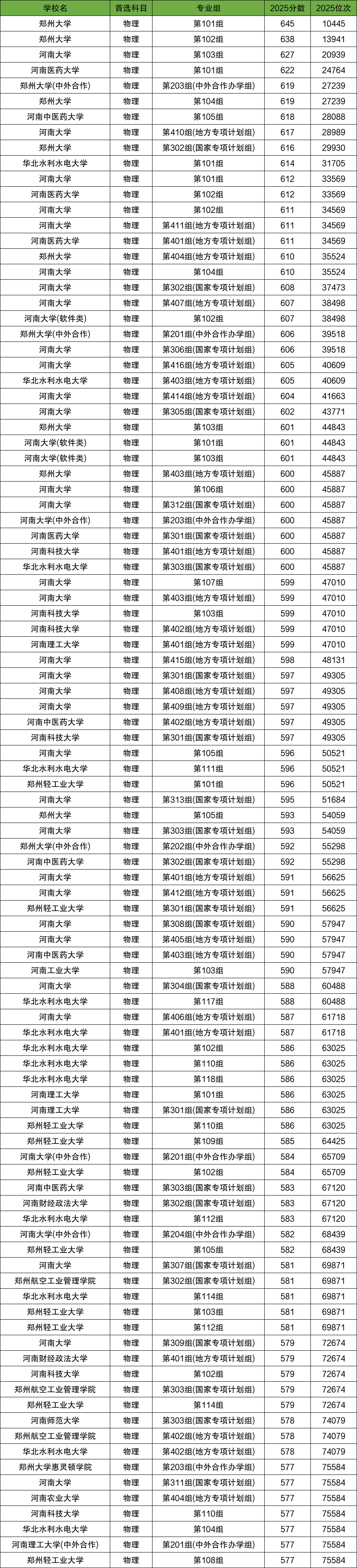 录取分数最高、最难考的是郑州大学第101组,2025年的录取分数是645分,所在的位次是第10445名;录取分数最低、最好考的是郑州商学院第201组(中外合作办学组)、安阳学院第902组(单列专业组)、新乡工程学院第102组等,2025年的录取分数是427分,所在的位次是第348358名。
