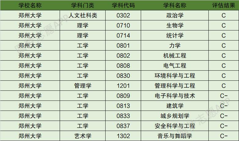 其中郑州大学B+类学科有马克思主义理论、考古学、化学、材料科学与工程、水利工程、化学工程与技术、公共管理,B类学科有法学、新闻传播学、数学、土木工程、软件工程、临床医学、药学,其余均为郑州大学B-类学科。