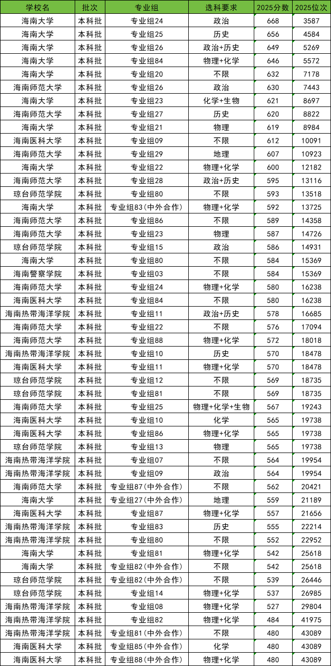 除上方的最低分院校外,海南省内的低分公办本科大学还有海南大学、琼台师范学院等,这些院校2025年最低分均在550分以下。