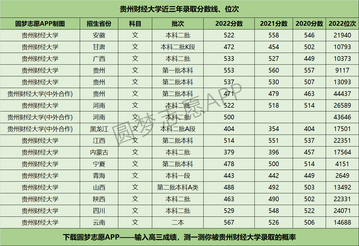 二、贵州财经大学近三年录取分数线及位次【文科版】