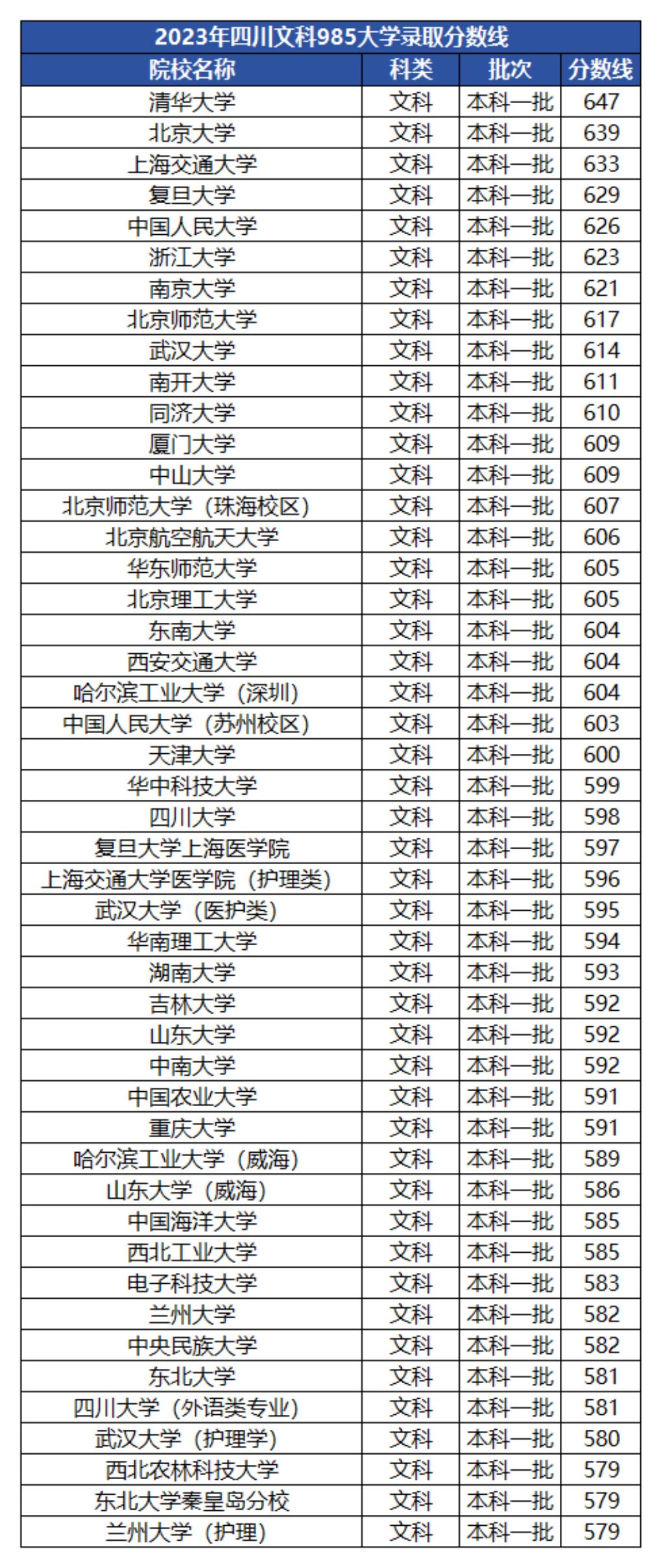 2023年全国39所985大学在四川文科的最低录取分数为579分,该分数段的院校有3所,分别是西北农林科技大学、东北大学秦皇岛分校和兰州大学(护理学)。这也意味着,如果想上985大学,文科考生最低需要579分。