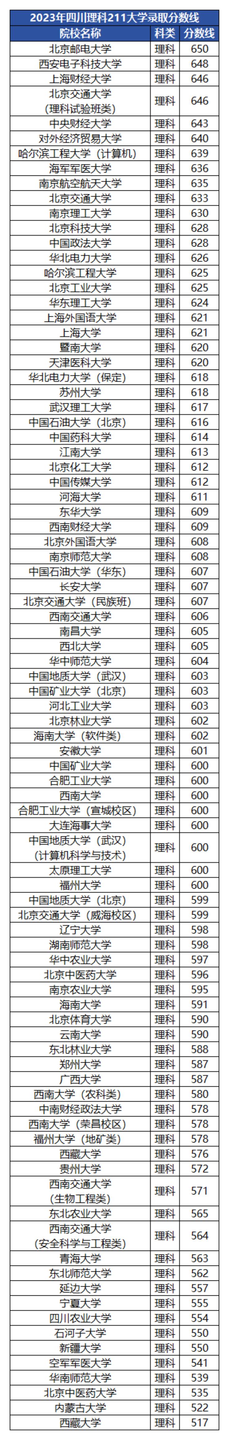 包含39所985大学在内,2023年全国211大学在四川理科的最低录取分数为517分,对应院校为西藏大学,学校在四川文科二本批次进行招生,录取分数低于一本线3分。西藏大学也是在四川招生的116所211高校中唯一一所录取分数低于一本线的大学。