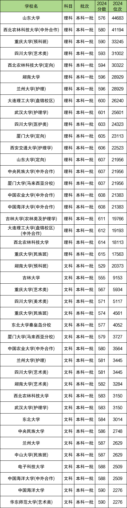 文科分数较低的985大学有吉林大学、重庆大学(艺术类)、东北大学、中央民族大学、兰州大学等。以上大学2024年最低分均低于590分,最低位次均高于2276名。