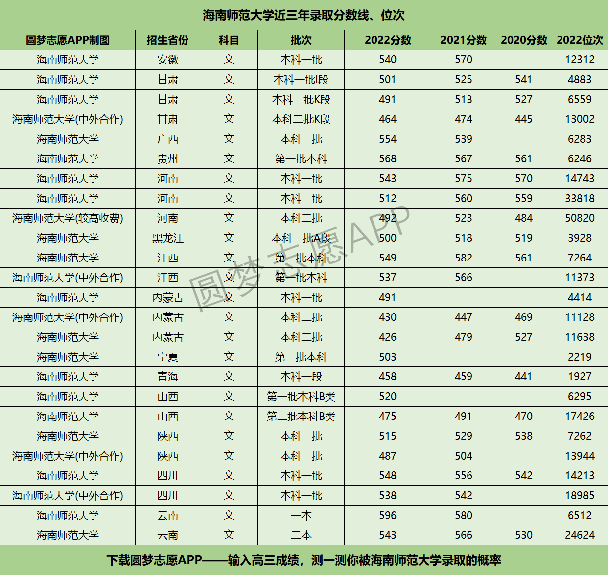 二、海南师范大学近三年录取分数线及位次【文科版】