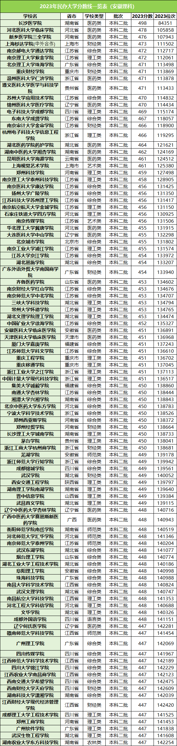 小编在此以安徽省为例,整理了2023年安徽民办大学录取分数线排名名单,如下: