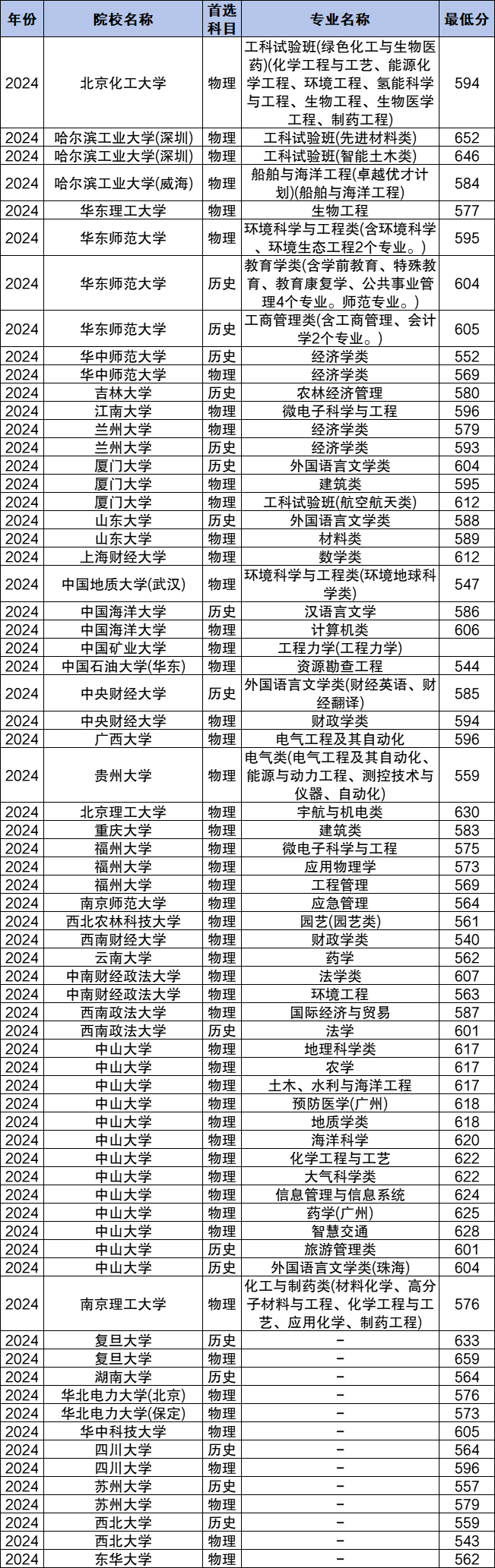 2024年各个高校专项计划大学最低分数线: