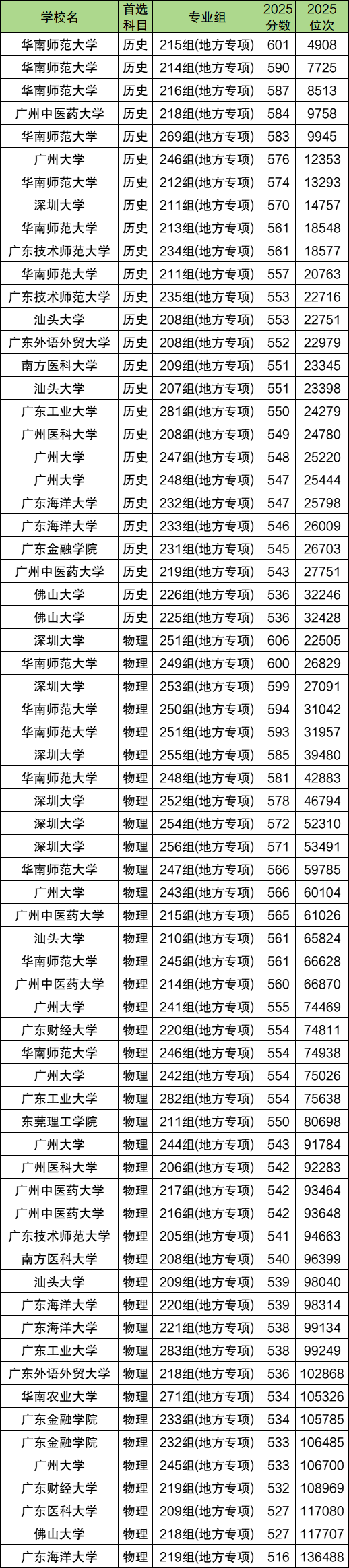 2025年广东地方专项计划最低录取分数线:历史类536分、物理类516分。