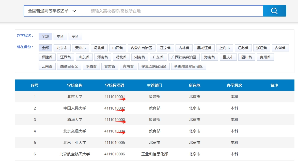 由于篇幅限制,本文只整理出北京市内大学的院校代码,全国所有大学的院校代码请在以下链接查看(最后五位数即为院校代码):