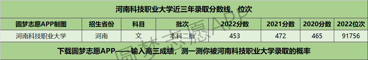 以河南科技职业大学在河南近三年文科的招生情况为例,学校2022年在本科二批的最低分为453分,2021年在本科二批的最低分为472分,2020年在河南的最低分为465分,三年的最低分范围为453~472分。