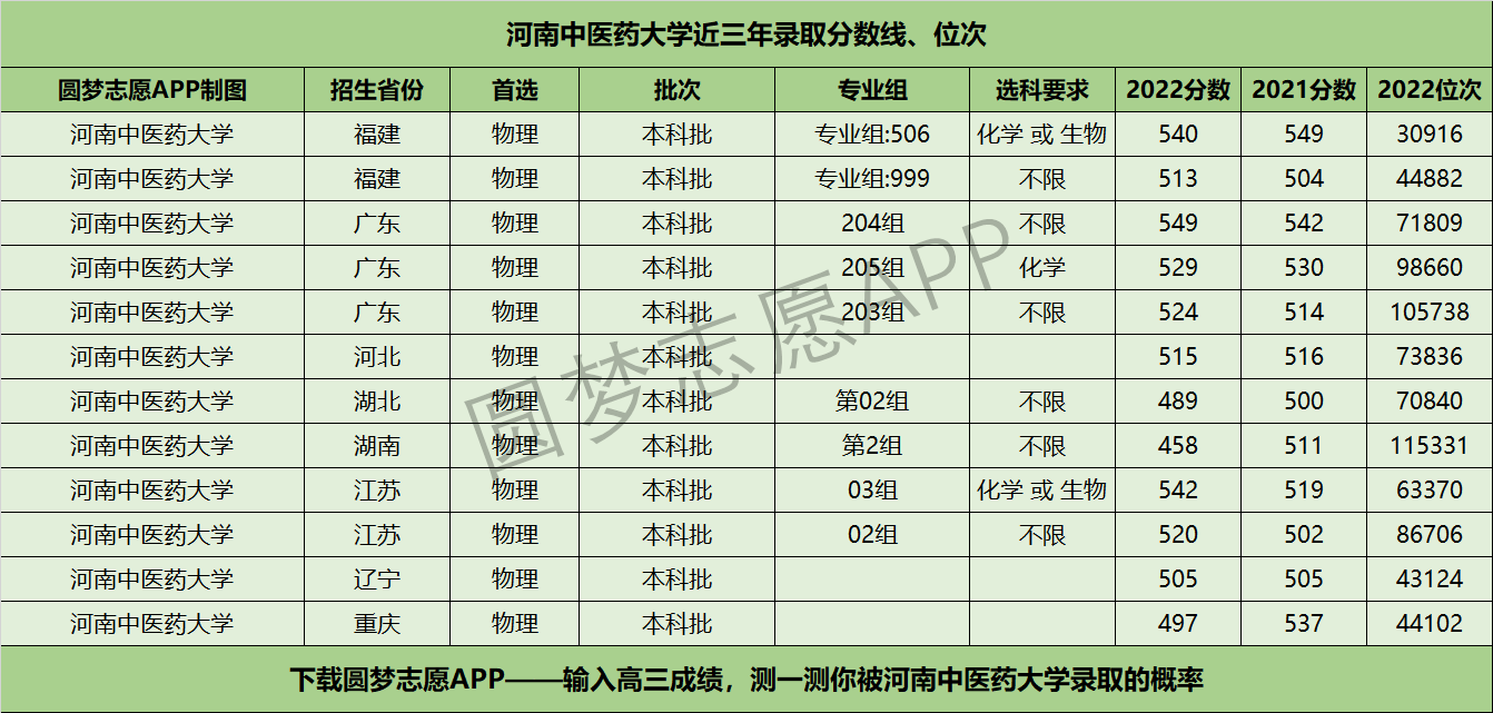 三、河南中医药大学近年录取分数线及位次【首选物理版】